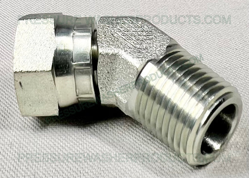 1/2" MPT x 3/8" FNPT Swivel Street 45 Elbow Steel for High Pressure Use We highly recommend this 1/2" x 3/8" Swivel 45 degree high pressure stre...