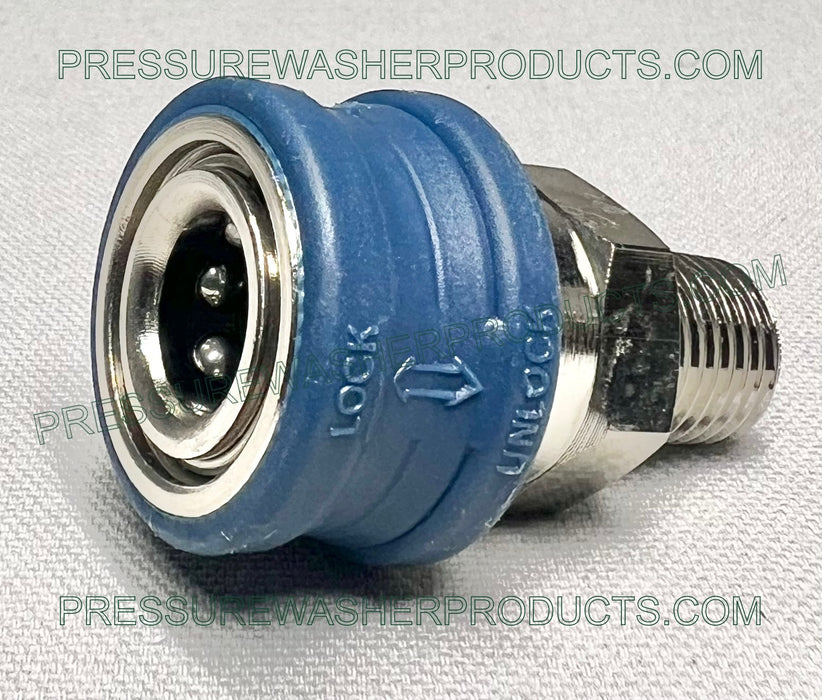 This male coupler is used on the outlet of a high pressure gun. The stainless steel balls can be lubricated by pulling back the coupler sleeve and applying never seize or anti-seize compound.